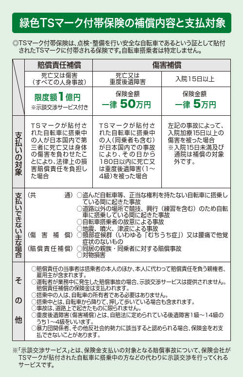 「障害保険」と「賠償責任保険」と「被害者見舞金」(赤色TSマークのみ)が付帯しています。